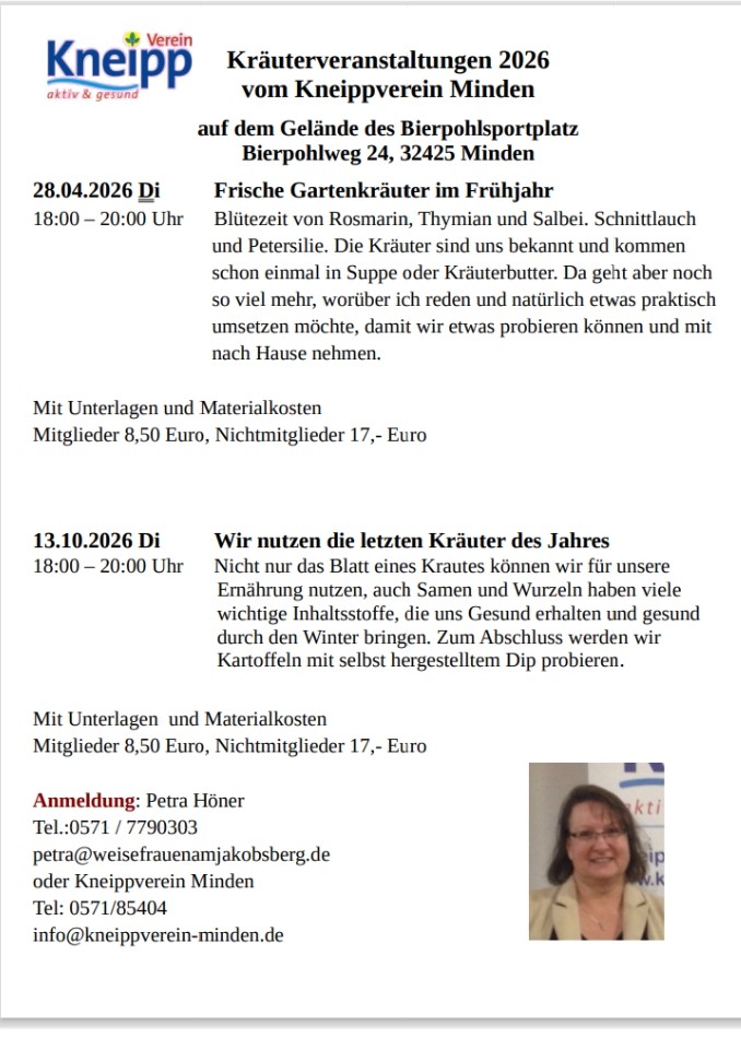 - Kräuterveranstaltung “Frische Gartenkräuter im Frühjahr”, 18:00 - 20:00 Uhr an der roten Hütte auf dem Bierpohlsportplatz